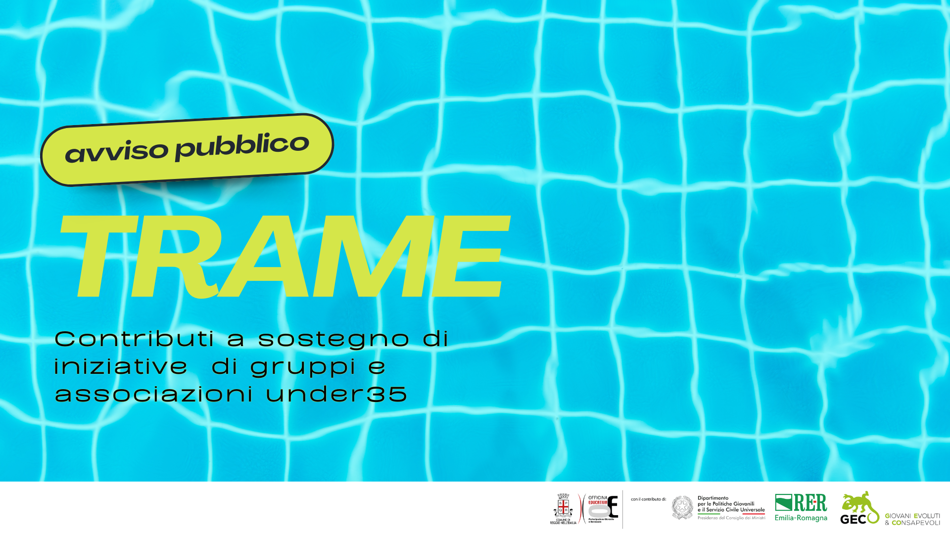 Le proposte possono configurarsi come singoli eventi, rassegne, laboratori su diversi linguaggi creativi, attività formative, di animazione, di attivazione di under 35 e sviluppo di comunità, ma anche realizzazione di opere concrete a uso pubblico e devono realizzarsi nel territorio del Comune di Reggio Emilia.
