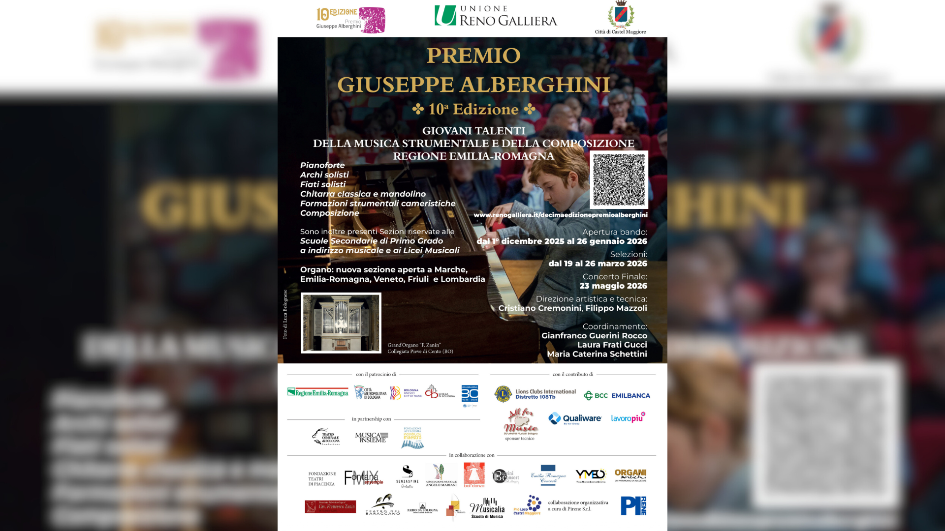SELEZIONI: dal 19 al 26 marzo 2026 Sala Maria Grazia Cutuli – Parco del Sapere Ginzburg (PAS) Castel Maggiore (BO). La Sezione Organo si svolgerà presso la Collegiata di Santa Maria Maggiore di Pieve di Cento.