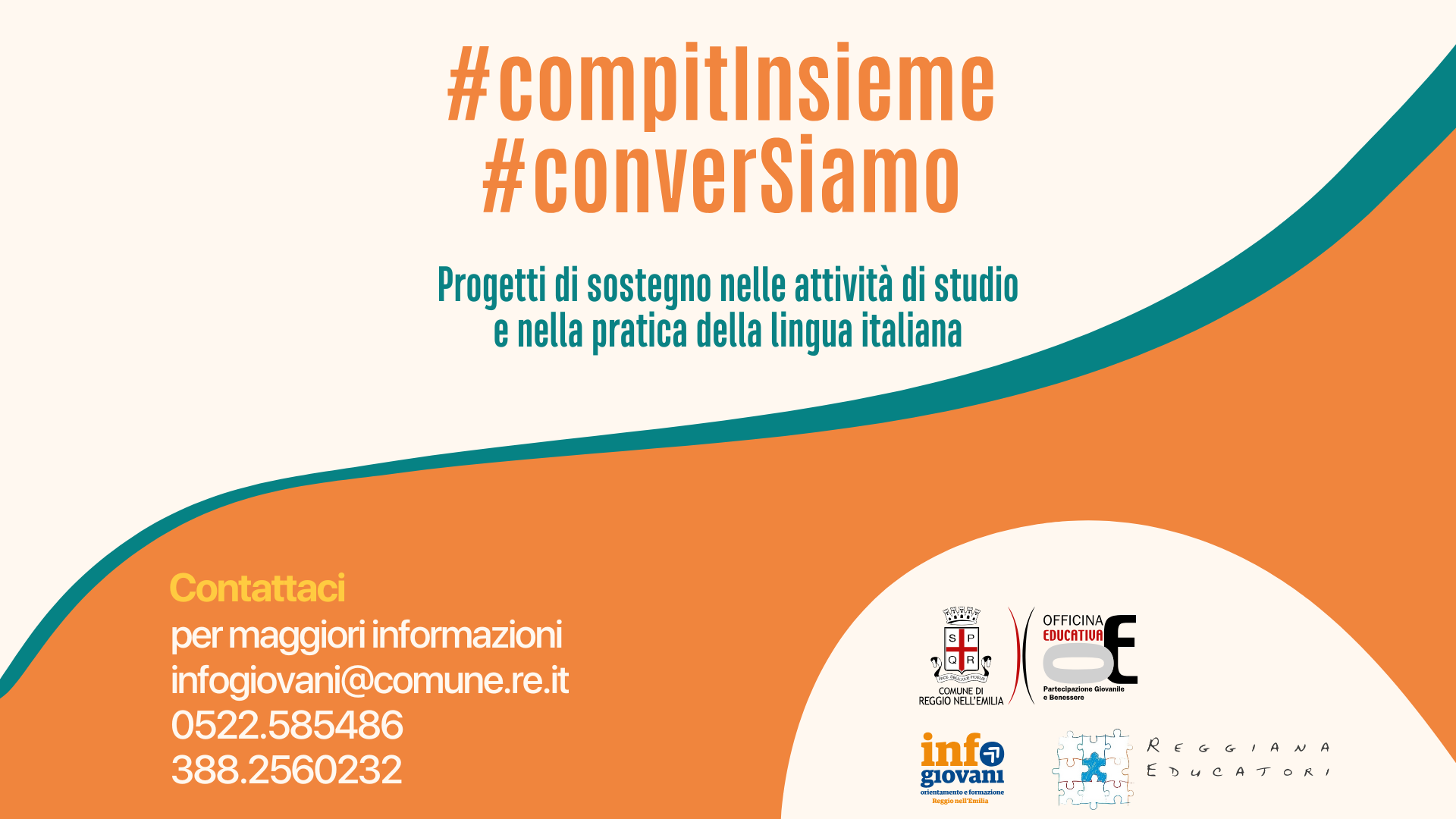 #compitInsieme e #converSiamo sono progetti di tutoring on line per il sostegno scolastico e per la pratica della lingua italiana inseriti nelle proposte di Giovani Protagonisti, promossi da Officina Educativa U.O.C. Partecipazione giovanile e Benessere del Comune di Reggio Emilia, in collaborazione con la cooperativa Reggiana Educatori.
